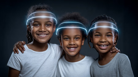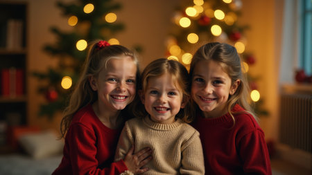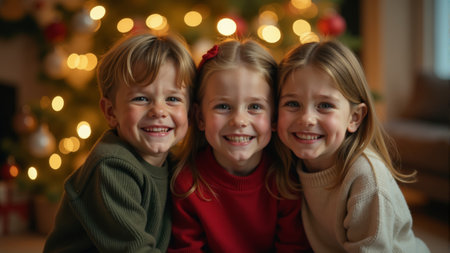 Three cheerful children pose together with warm smiles, surrounded by twinkling lights and holiday decorations, capturing the joy and spirit of a cozy Christmas celebration.