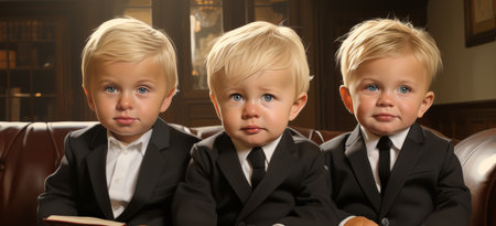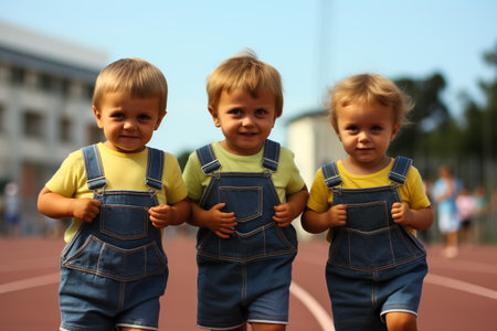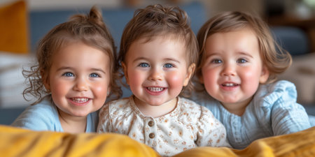 Three baby toddlers. Cute Happy triplets together