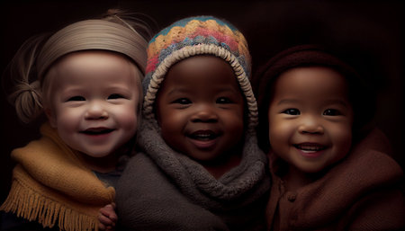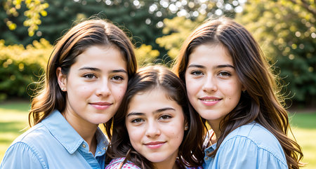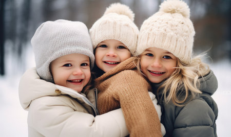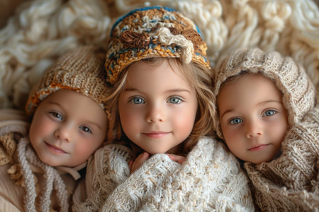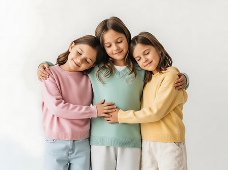 This heartwarming image captures three young girls standing together, embracing each other with love and affection. They are dressed in pastel-colored sweaters and white pants, creating a soft and serene atmosphere. The girls have their eyes closed, conveying a sense of comfort and trust in each other's company.