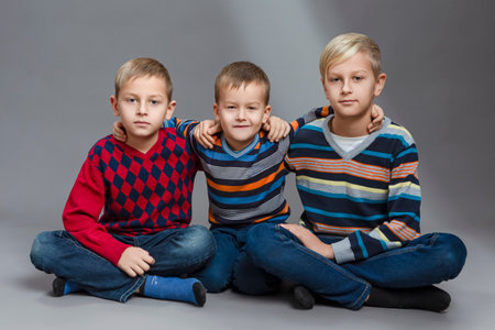 Group of Three Male Caucasian Brothers Standing Together Embraced Over Gray Background.Horizontal Image Composition