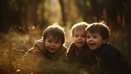 Smiling caucasian boys playing in nature, embracing happiness and togetherness generated by artificial intelligence