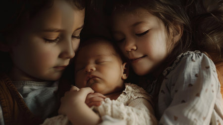 A warm, intimate photo of two siblings gently cuddling with their sleeping newborn sibling, capturing a moment of familial love.