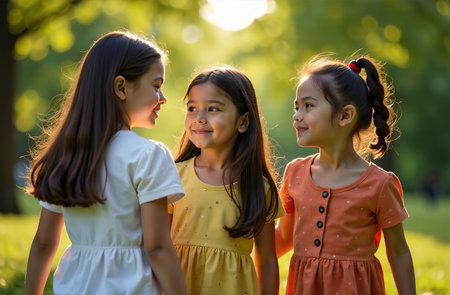 Three young girls share a joyful moment, laughing together in a lush green park as sunlight filters through the trees, creating a magical atmosphere of happiness.