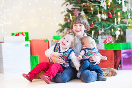 Three happy children - cute boy, his toddler sister and a newborn baby - sitting under a beautiful Christmas tree