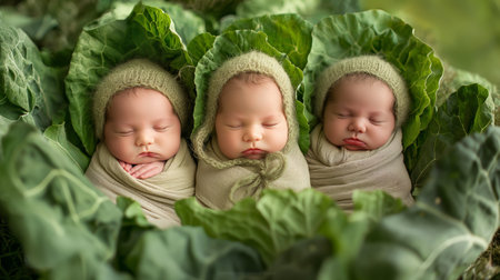 Triplets Sleeping Snugly Among Cabbage Leaves