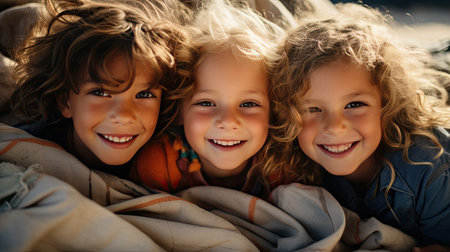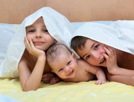 Two children and a baby under the sheets of a bed having fun. Portrait looking at camera