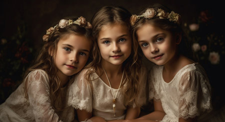 Cute girls in dresses smiling, looking at camera generated by artificial intelligence
