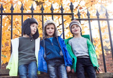 Three boys outdoors, leaning against fence, low angle view