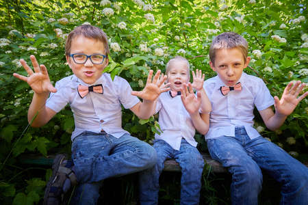 Boys in white shirts and a pink butterfly in nature among the greenery. Funny walk of three brothers in the park or forest