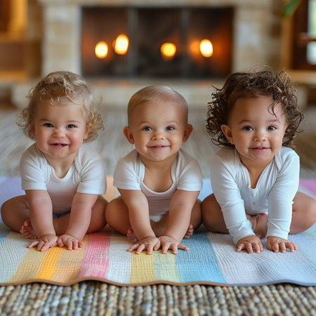 Three adorable babies sitting on the floor in front of fireplace at home