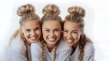 Three smiling women with long brown hair looking cheerful while posing together on a white reflective table