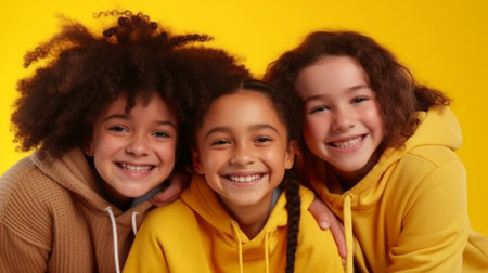 Generative AI : group of cheerful happy children on a colored yellow background