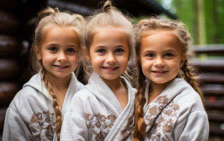 Three smiling little girls in bathrobes on the background of a wooden house