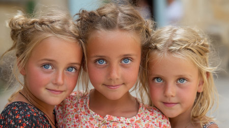 Three girls stand close together smiling brightly with their blue eyes. They wear colorful outfits and share a moment of joy in a sunny outdoor location near an old structure.