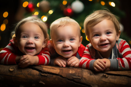Three happy babies in Christmas pajamas