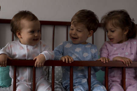 Cute cheerful 3 little kids girl and boy siblings preschool children in grey baby crib after waking up from sleep in pajamas with legs dangling. Childhood, leisure, comfort, medicine, health concept