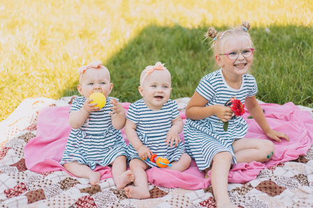 Three sisters in striped dresses are resting in the park on the grass