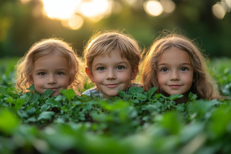 Three children enthusiastically plant seeds together in a lush garden filled with green plants under the bright afternoon sunlight, sharing joyful moments and teamwork.