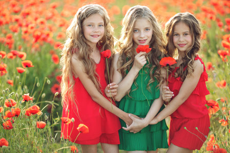 Group of happy children playing outdoors. Children have fun in the spring park. Girls run in the field with poppies. High quality photo.