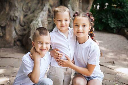 Happy cute children wearing white shirts. adorable girl is hugging her small brothers in the park. concept of love and family
