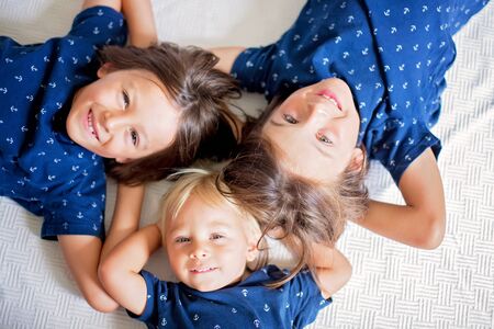 Five years old girl with her brothers - twins lying on the bed