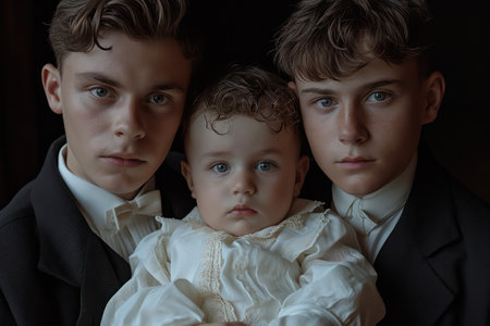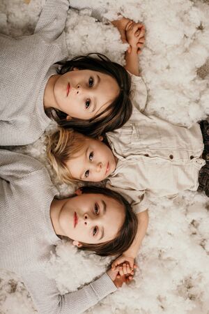 Beautiful portrait of three sibling boys, lying on the floor in a pile of cotton, holding hands and looking at camera