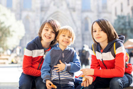 Cute little children tourists admiring Barcelona city, family travel with kids in Spain