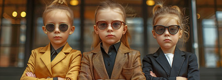 In front of a business centre are three small, serious, and stylish girls wearing business suits and sunglasses.