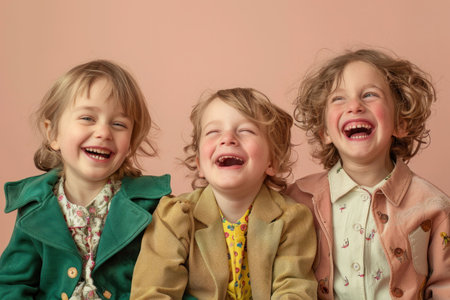 Happy Children Laughing Together Against a Vibrant Pink Background with Colorful Jackets