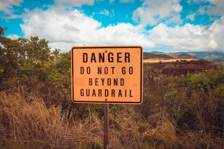 Warning sign near Waimea Canyon in the Hawaiian island of Kaua'i, Hawaii, USA, on Waimea Canyon is known as the Grand Canyon of the South Pacific. It is approximately ten miles (16 km) long and up to 3,000 feet (900 m) deep, located on the western side of Kaua'i. It was formed by the deep incision of the Waimea River arising from the extreme rainfall on the island.