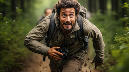 A funny tourist with a camera and backpack is excitedly running through a lush, green forest, capturing the adventure and thrill of exploration.