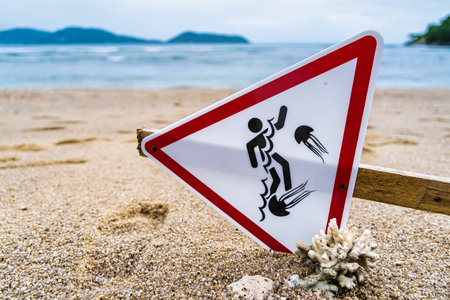 Warning sign for swimming in the sea, beware of jellyfish, placed on the beach