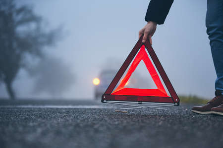 Traffic problem in thick fog. Driver putting warning triangle behind his broken car.