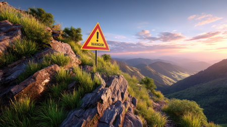 Majestic mountain scene featuring a prominently placed warning sign amidst lush green grass and rocky terrain during a stunning sunrise.