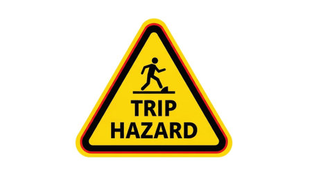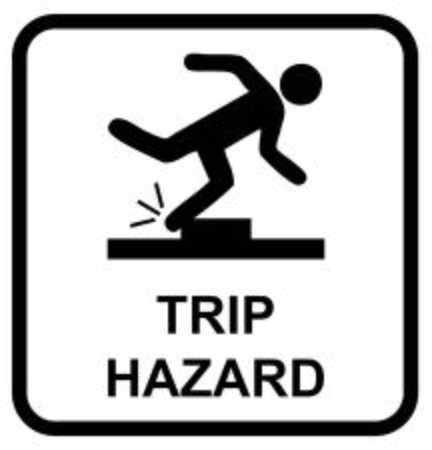 Caution tripping hazard sign on a wall.