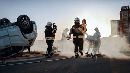 Brave Firefighter Carries Injured Young Girl to Safety where She Reunited with Her Loving Mother. In the Background Car Crash Traffic Accident Courageous Paramedics and Firemen Save Lives