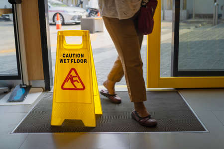 Yellow warning sign wet floor in shop.