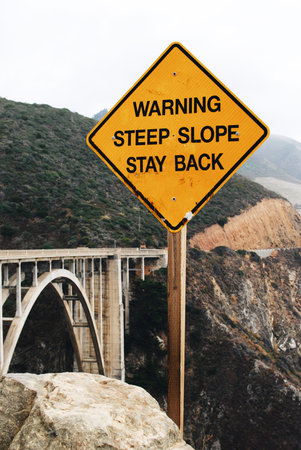 Warning steep slope stay back road sign, Bixby Creek Bridge, Big Sur, California