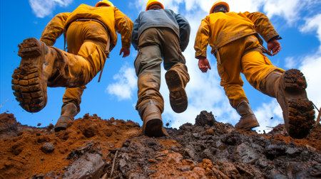 A determined group of men in yellow rain suits, running together uphill in adverse weather conditions.