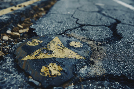A yellow triangle is on a cracked road. The road is cracked and has a lot of debris
