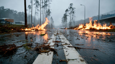 A rain-drenched road displays patches of burning foliage under heavy clouds. The scene captures a dramatic weather event unfolding with low visibility.
