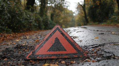 A close-up view of a warning triangle placed on a cracked road in autumn, surrounded by colorful trees, emphasizing the importance of road safety in natural settings.