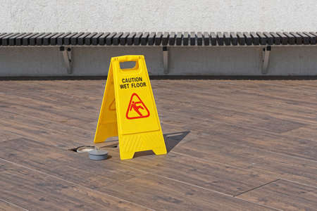 Caution wet floor sign at terrace patio