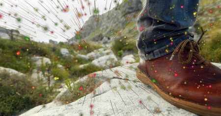 Balancing brown boot, jeans on pale rock amid grass, radiating colorful particle trails, copy space. Adventure, mobility, rugged, outdoors, travel, exploration, dynamic