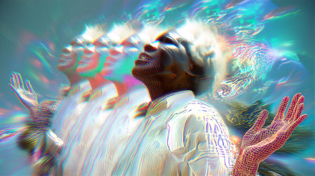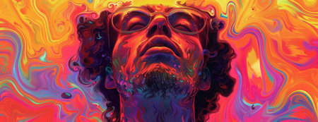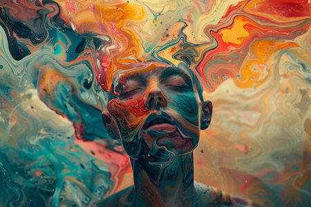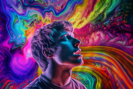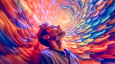 portrait of a man in hypnosis, colorful abstract world of illusion