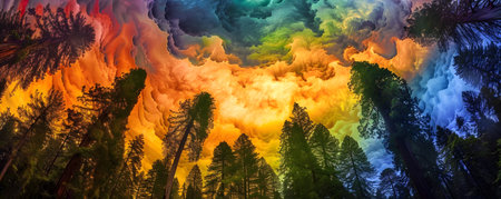 This breathtaking image depicts a towering redwood forest bathed in the vibrant ethereal glow of a rainbow painted sky The lush emerald foliage of the ancient trees contrasts with the explosion of