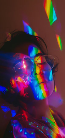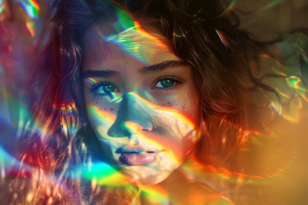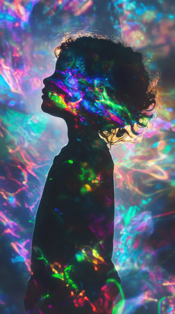 Vibrant colors dance across a serene profile, capturing the essence of light and beauty. A fusion of shadow and illumination creates a mesmerizing visual symphony. Generated A.I.