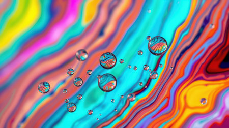 Colorful abstract background with vibrant swirling patterns and water droplets reflecting beautiful designs