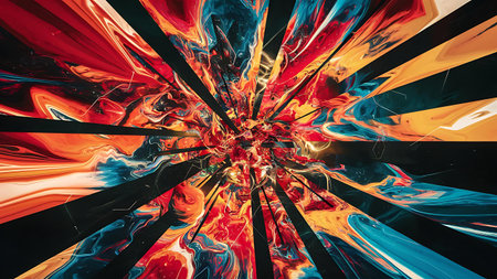 Dynamic abstract shapes and fire sparks create captivating artistic space