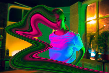 Beautiful abstract image of girl in fluorescent light of nightclub. Unusual portrait of beautiful girl who sees bright varicolored dream. Hallucinogen people.